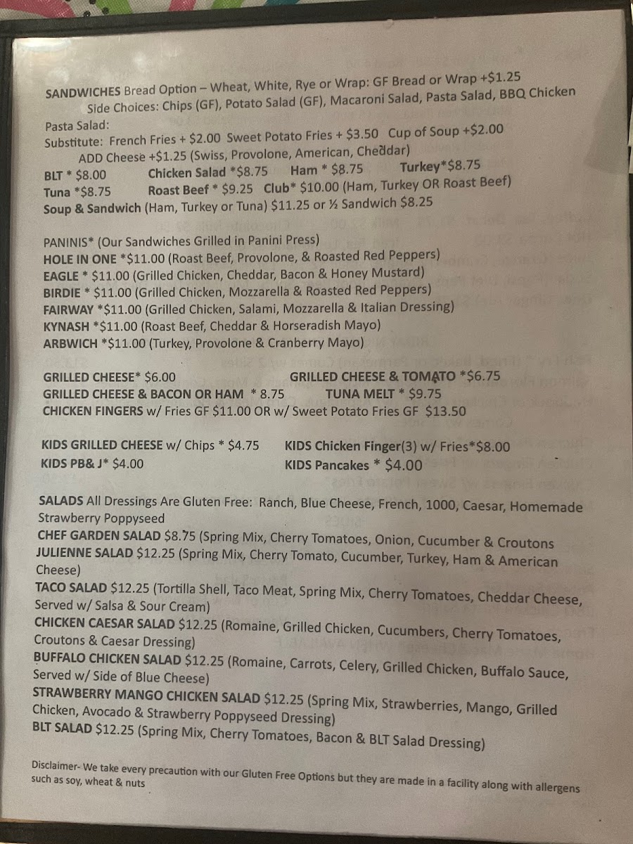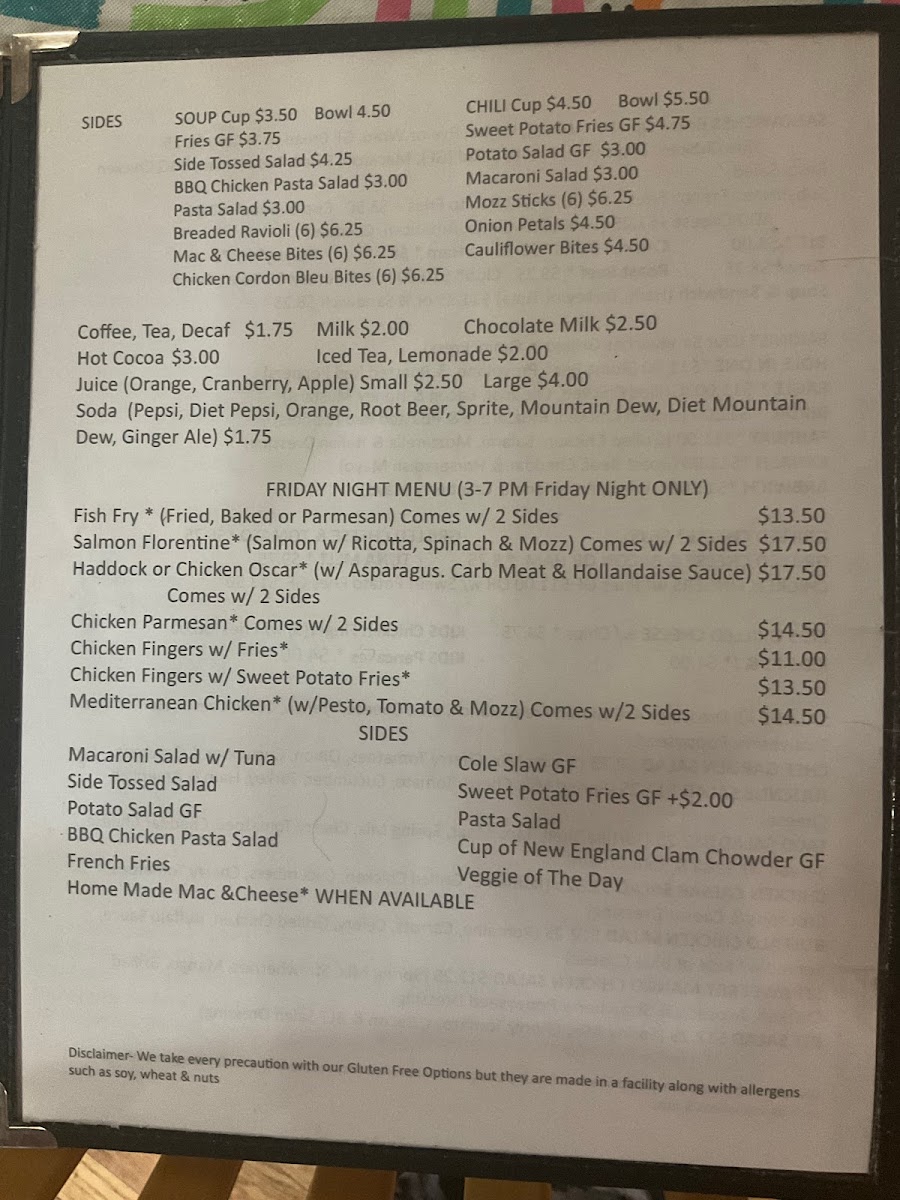 Breakfast: This section features a range of breakfast sides like toast, eggs, home fries, and hash. There are also several omelet choices, including cheese, meat lovers, and cheese lovers varieties, each served with home fries and toast.