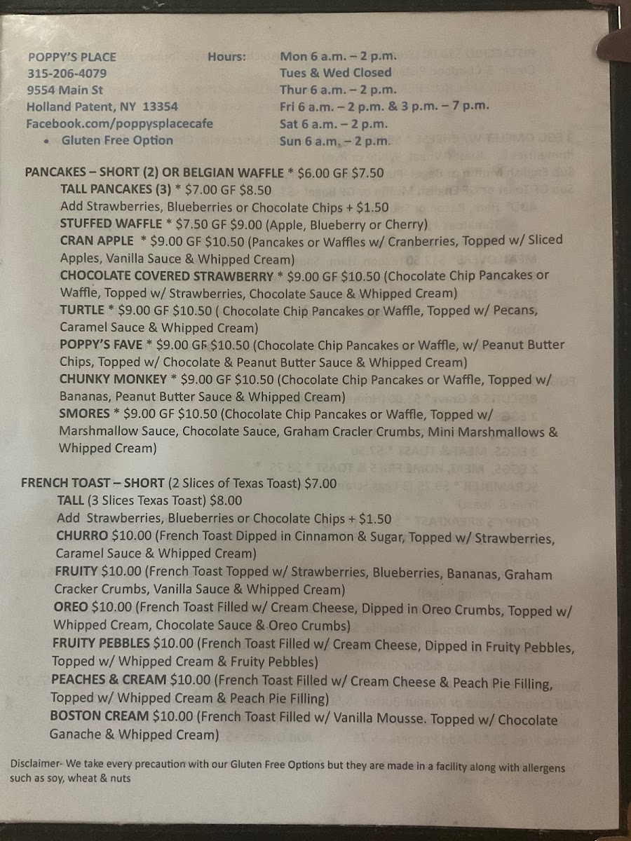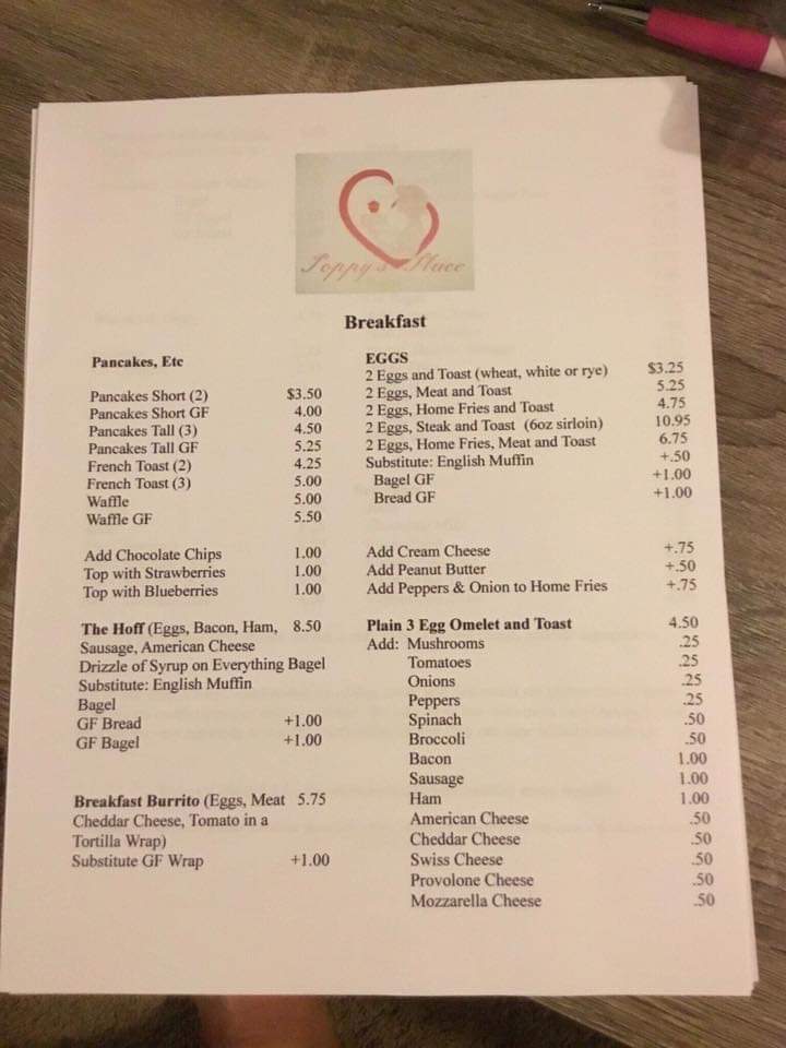 The menu at Poppy's Place offers a variety of food and beverage options suitable for breakfast, coffee breaks, and light meals. It is organized into several main sections to accommodate different preferences and needs.